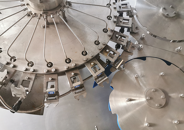 礦泉水自動灌裝生產(chǎn)線瓶子由通過風(fēng)送道傳遞,然后通過撥瓶星輪傳送至三合一機(jī)的沖瓶機(jī)。沖瓶機(jī)回轉(zhuǎn)盤上裝有瓶夾,瓶夾夾住瓶口沿一導(dǎo)軌翻轉(zhuǎn)180°,使瓶口向下。在沖瓶機(jī)特定區(qū)域,沖瓶夾噴嘴噴出沖瓶水,對瓶子內(nèi)壁進(jìn)行沖洗。瓶子經(jīng)沖洗、瀝干后在瓶夾夾持下沿導(dǎo)軌再翻轉(zhuǎn)180°,使瓶口向上。洗凈后的瓶子通過撥瓶星輪由沖瓶機(jī)導(dǎo)出并傳送至灌裝機(jī)。進(jìn)入灌裝機(jī)的瓶子由瓶頸托板卡住并在凸輪作用下將瓶子上升,然后由瓶口將灌裝閥頂開。灌裝采用重力灌裝方式。灌裝閥打開后物料通過灌裝閥完成灌裝過程,灌裝結(jié)束后瓶口下降離開灌裝閥,瓶子通過卡瓶頸過渡撥輪進(jìn)入旋蓋機(jī)。旋蓋機(jī)上的止旋刀卡住瓶頸部位,保持瓶子直立并防止旋轉(zhuǎn)。旋蓋頭在旋蓋機(jī)上保持公轉(zhuǎn)并自轉(zhuǎn),在凸輪作用下實(shí)現(xiàn)抓蓋、套蓋、旋蓋、脫蓋動作,完成整個(gè)封蓋過程。成品瓶通過出瓶撥輪從旋蓋機(jī)傳送到出瓶輸送鏈上,由輸送鏈傳送出三合一機(jī)。