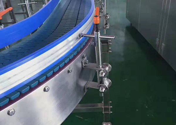 礦泉水自動灌裝生產線瓶子由通過風送道傳遞,然后通過撥瓶星輪傳送至三合一機的沖瓶機。沖瓶機回轉盤上裝有瓶夾,瓶夾夾住瓶口沿一導軌翻轉180°,使瓶口向下。在沖瓶機特定區域,沖瓶夾噴嘴噴出沖瓶水,對瓶子內壁進行沖洗。瓶子經沖洗、瀝干后在瓶夾夾持下沿導軌再翻轉180°,使瓶口向上。洗凈后的瓶子通過撥瓶星輪由沖瓶機導出并傳送至灌裝機。進入灌裝機的瓶子由瓶頸托板卡住并在凸輪作用下將瓶子上升,然后由瓶口將灌裝閥頂開。灌裝采用重力灌裝方式。灌裝閥打開后物料通過灌裝閥完成灌裝過程,灌裝結束后瓶口下降離開灌裝閥,瓶子通過卡瓶頸過渡撥輪進入旋蓋機。旋蓋機上的止旋刀卡住瓶頸部位,保持瓶子直立并防止旋轉。旋蓋頭在旋蓋機上保持公轉并自轉,在凸輪作用下實現抓蓋、套蓋、旋蓋、脫蓋動作,完成整個封蓋過程。成品瓶通過出瓶撥輪從旋蓋機傳送到出瓶輸送鏈上,由輸送鏈傳送出三合一機。